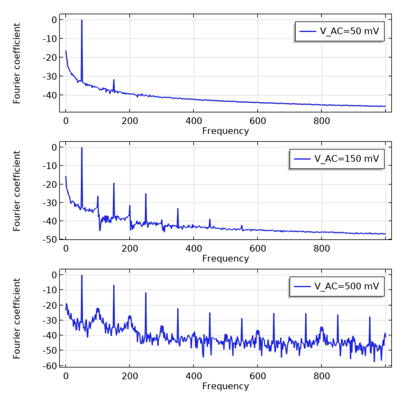 These time domain data can also be Fourier transformed into the frequency domain, which more clearly identifies the higher harmonics that are introduced by the material nonlinearity. Since the electrical circuit model is quick to solve, we can also quickly examine a wide range of operating conditions. As expected, there is more high frequency content as the device is driven into the nonlinear regime.