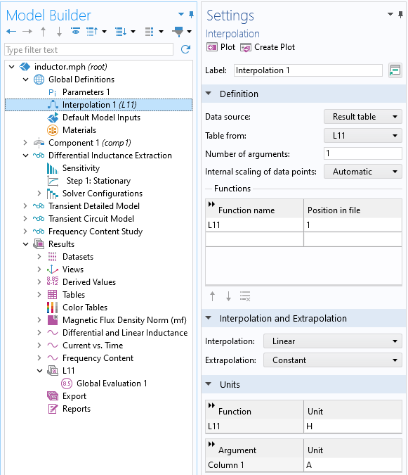 After solving, create an Interpolation function that refers to an Evaluation Group so that the results of the differential inductance calculation can be used elsewhere in the model.